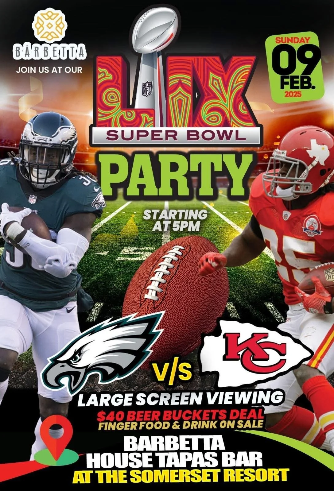 Barbetta House Tapas Bar at the Somerset Resort has a Super Bowl Watch Party starting at 5pm. The game will be playing on their 2 big screen TVs and they are offering a $40 beer bucket deal plus finger food + drinks for sale.